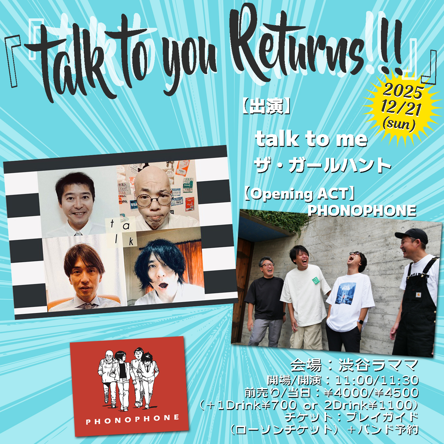 《出演》talk to me / ザ・ガールハント / Opening ACT:PHONOPHONE